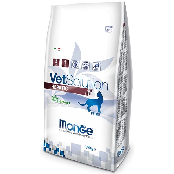 Monge VetSolution Hepatic Feline è un alimento dietetico completo formulato per il supporto della funzione epatica in caso di insufficienza epatica cronica nei gatti.