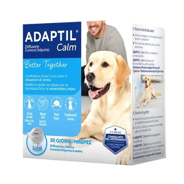 ADAPTIL Calm Diffusore è un’eccellente soluzione per aiutare il tuo cane a rimanere calmo a casa ed adattarsi a situazioni come rimanere solo a casa, rumori forti, estranei e paure Previene e controlla lo stress nei cuccioli e nei cani adulti